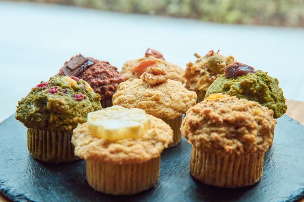 おから、小麦粉、きび砂糖、卵、米油、ふすま、ベーキングパウダー、(メープル)メープルシロップ、くるみ、(ショコラ)ココア、チョコレート、(チョコバナナ)バナナ、チョコレート、(抹茶あずき)抹茶パウダー、小豆あん、(レモン)レモン、はちみつ、(オレンジマーマレード)マーマレードジャム、(ラムレーズン)レーズンラム酒漬け、クリームチーズ、(ベリー&ホワイトチョコ)ミックスベリー、ホワイトチョコ、(黒ごま)黒ごまペースト、(コーン&ベーコン)コーン、ベーコン、チーズ、にんじん、(オリーブごぼう)ごぼう、オリーブ、松の実、オリーブオイル、にんにく